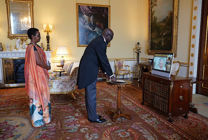 On Friday 29th April at Buckingham Palace High Commissioner Johnston Busingye presented his credentials to Her Majesty Queen Elizabeth II, who received the High Commissioner and his wife via video-call from Windsor Castle.